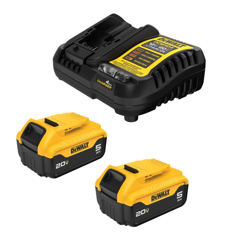 Kit de Inicio DeWalt 20V MAX: Dos Baterías 5.0Ah y Cargador DCB205-2C. El kit esencial para cualquier profesional o entusiasta del bricolaje. Incluye dos baterías de 5.0Ah de larga duración para un rendimiento constante y un cargador eficiente. El amperaje de 5.0Ah ofrece un equilibrio perfecto entre peso, potencia y tiempo de ejecución. * Contenido del Kit: 2 Baterías de 5.0Ah (DCB205) y 1 Cargador Rápido. * Uso: Excelente para herramientas de alto uso como taladros, atornilladores de impacto y sierras.