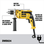 Rotomartillo DeWalt 1/2" Velocidad Variable Reversa DWD024: Versátil y Compacto. Taladro/Rotomartillo de 1/2 pulgada con funciones de velocidad variable y reversa. El modo de percusión permite perforar ladrillo y mampostería, mientras que el modo taladro es ideal para madera y metal. Diseño compacto para facilitar su uso en espacios reducidos. * Control: Gatillo de velocidad variable para una perforación precisa. * Portabilidad: Ideal para el hogar y trabajos de instalación ligera.