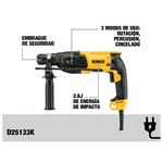 Rotomartillo DeWalt SDS Plus 800W 3 Modos D25133K: Perforación Rápida en Concreto. Rotomartillo de 800W con mandril SDS Plus y 3 modos de operación (rotación, percusión, cincelado). Ofrece una excelente relación peso-potencia, ideal para perforaciones de anclajes en concreto, ladrillo y mampostería. El embrague de seguridad protege al usuario en caso de atasco. * Modos: Taladro, Rotomartillo y Cincelado. * Uso: Instalación de anclajes de 4 a 22 mm en concreto.